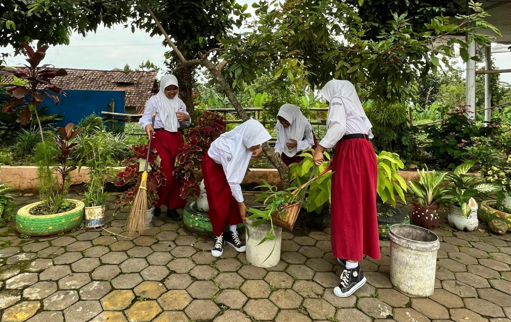 Sejak pagi hari, para siswa tampak menyebar ke berbagai titik area sekolah untuk melakukan kerja bakti. Mereka membersihkan ruang kelas, halaman, taman sekolah, hingga saluran air. Tidak hanya memungut sampah, para siswa juga memilah sampah organik dan nonorganik sebagai bentuk edukasi pengelolaan sampah sejak dini.